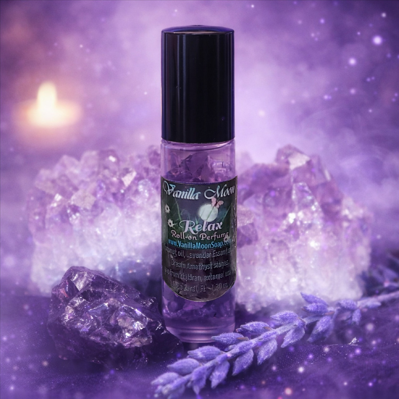 Relax Roll-on Perfume is a beautiful combination of skin soothing oil and Lavender Essential Oil infused with Dream Amethyst crystals. Dream Amethyst (also called Chevron Amethyst) is a mixture of Amethyst and White Quartz. It combines the strengthening and enhancing qualities of Quartz with the calming qualities of Amethyst, making it a wonderfully spiritual stone. Dream Amethyst encourages and supports inner strength, repels negativity and helps to bring relaxing peaceful vibes.